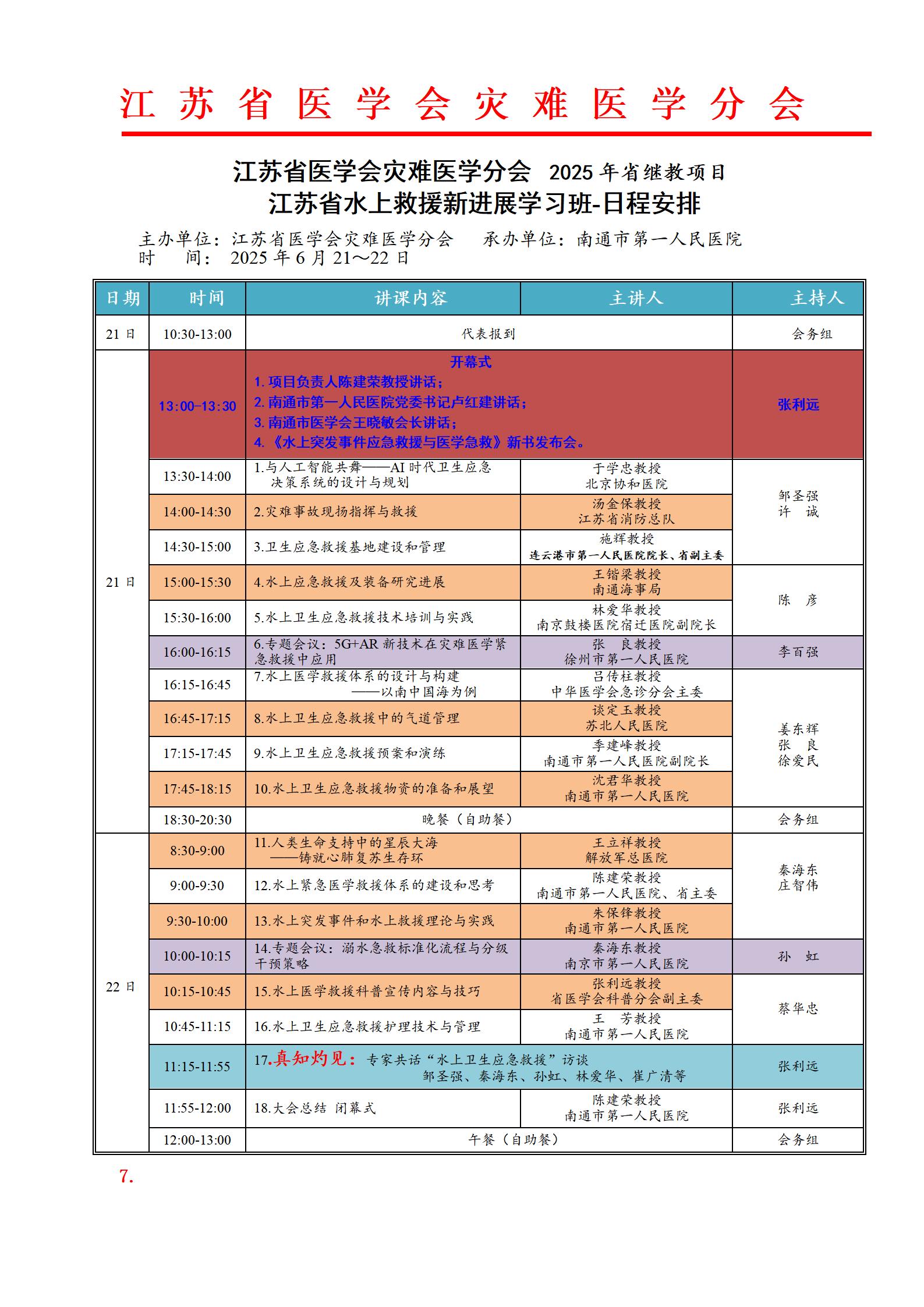 为进一步贯彻国家“努力提升应急救援能力”的要求,努力提升紧急医学救援水平,我会定于2025年6月21-22日在南通举办“水上救援新进展学习班”。届时将邀请省内外知名专家作专题学术报告。欢迎广大从事相关专业的人员踊跃报名、积极参与!现将学习班有关事项通知如下: