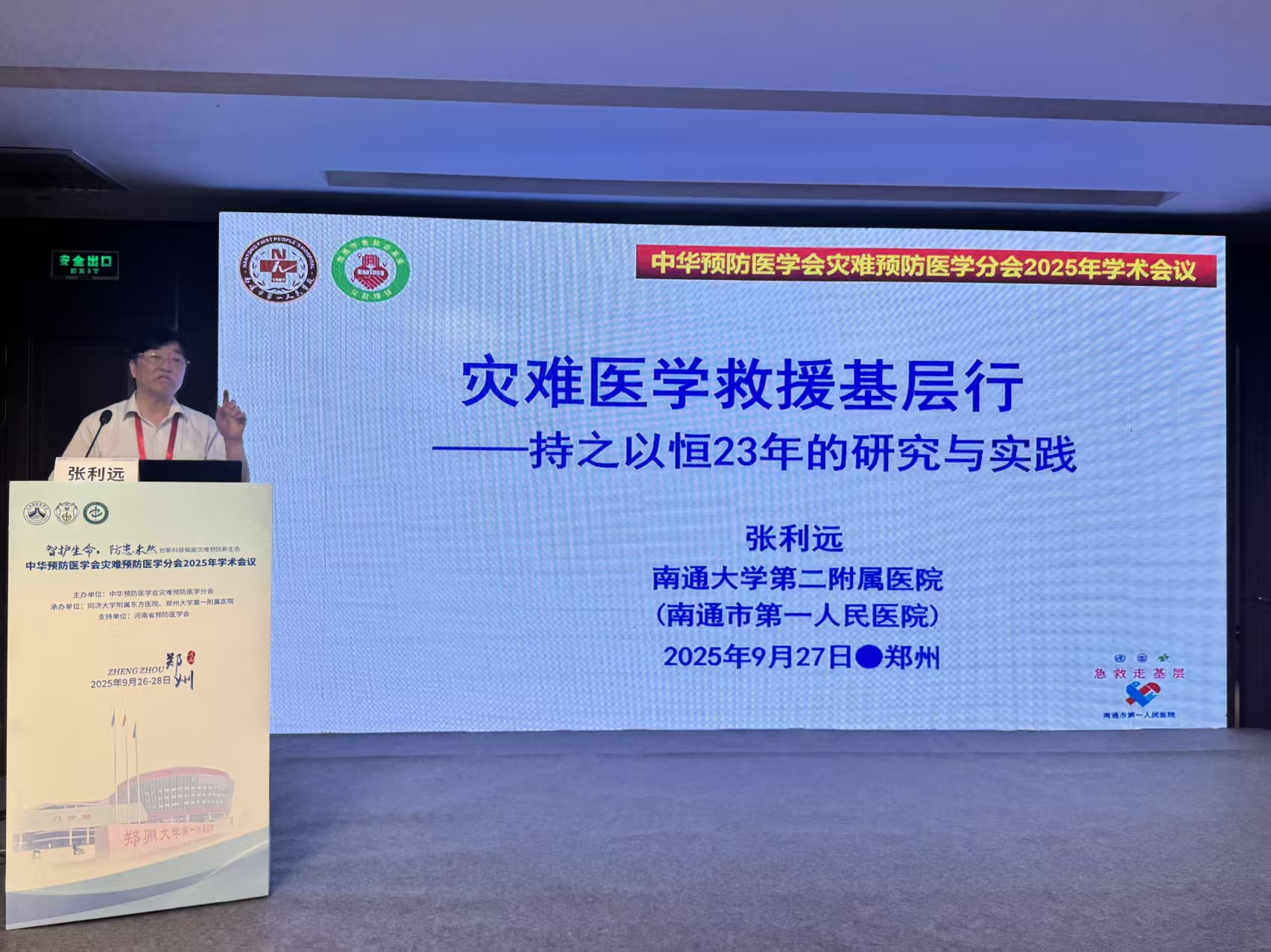 上图:2025.9.27,张利远教授应邀赴郑州,在中华预防医学会灾难预防医学分会2025年学术会议作了“灾难医学救援基层行-持续23年的研究与实践”专题报告。